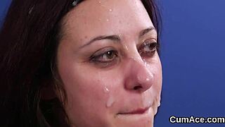 randy beauty feels the extreme pleasure of cumshots on her face, eating every drop.