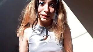 Liftergirl's big tits petite teen stuffs lipstick in pussy, guard fucks for freedom!