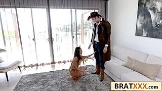 Petite Asian Babe in Pocahontas Outfit Rides Cowboy Monster Cock Hard
