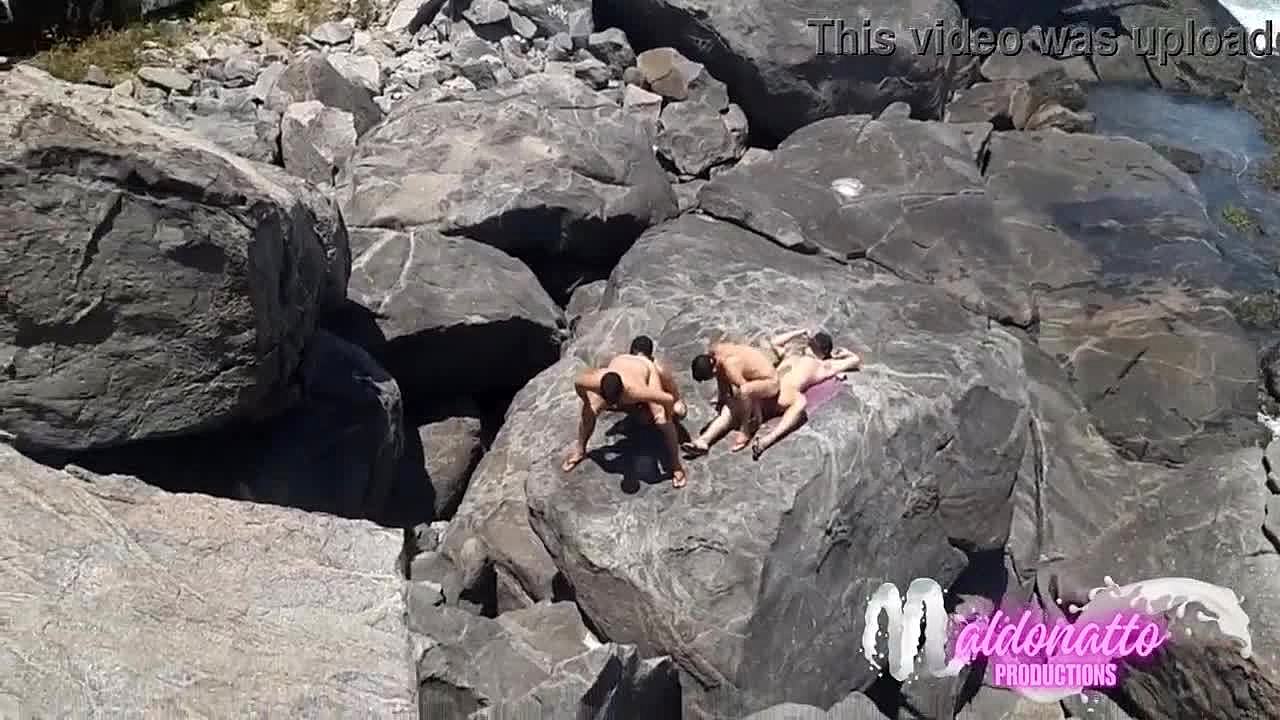 Wild orgy on deserted beach with naughty girls licking and banging